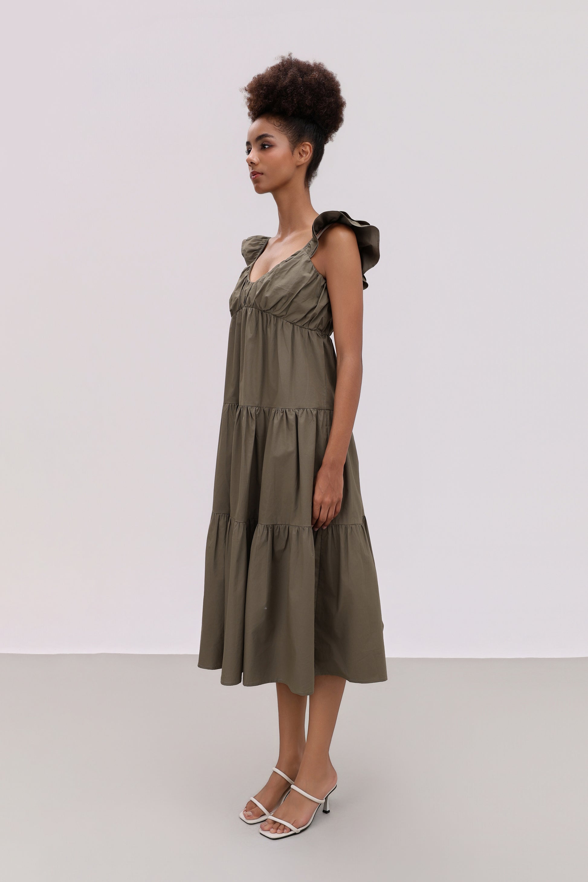Experience understated elegance with the Amanda Olive Cotton Blend Dress. Crafted from cotton blend for breathable comfort, this sophisticated piece showcases delicate ruffle sleeves and progressive tiered layers. Adjustable elastic shoulder straps provide a customized fit, while the classic black hue ensures effortless versatility across your wardrobe.