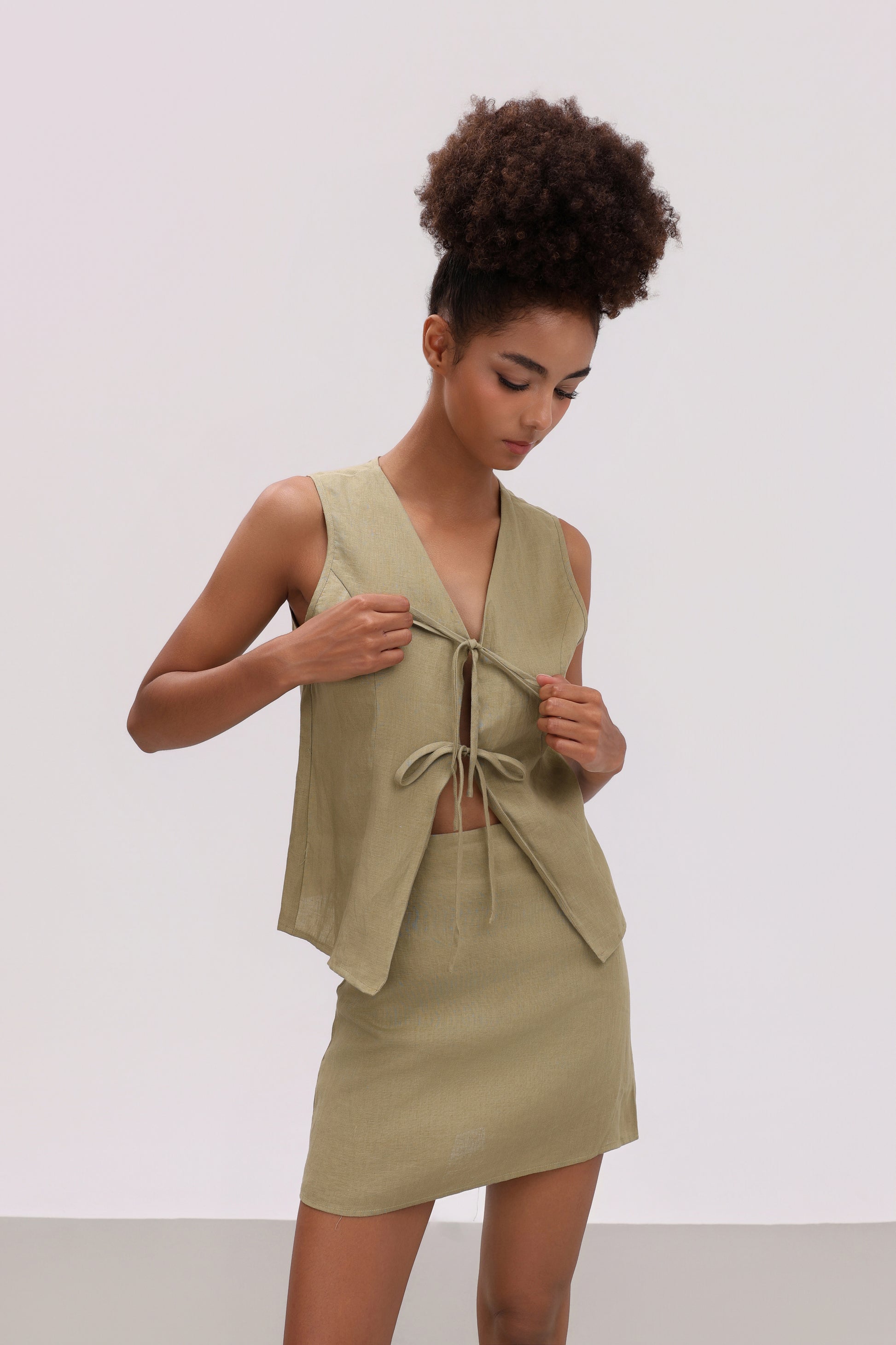 LEENA OLIVE LINEN TIE FRONT TOP